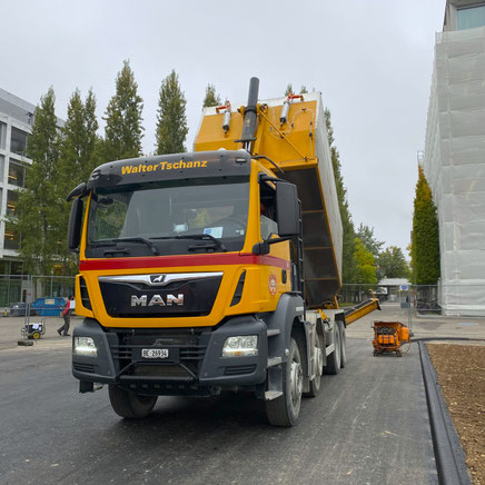 Mit einer speziellen Einrichtung an der Thermomulde können wir den Asphalt in verschieden grosse Formen befördern, die Asphalt-Borduren formen.